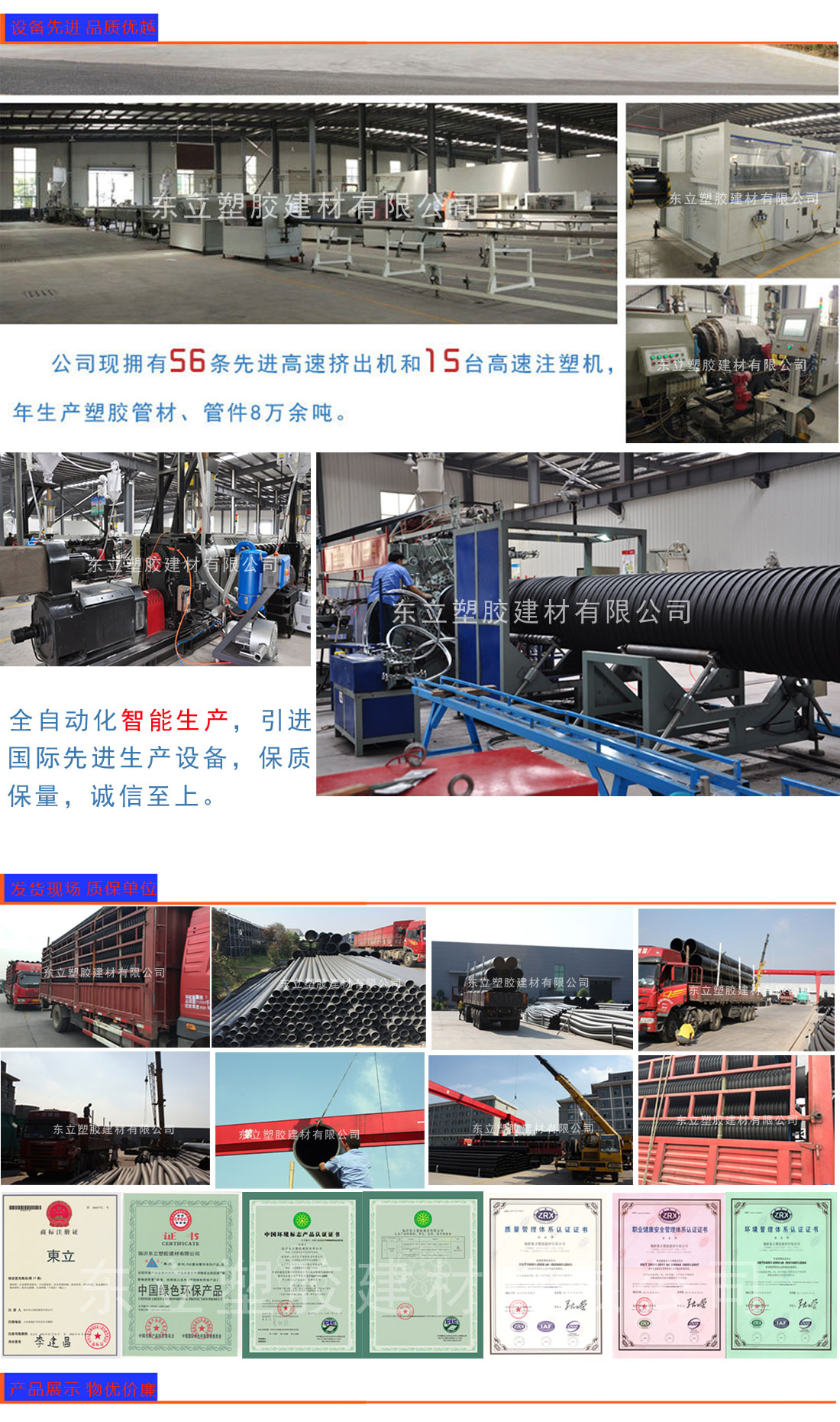 PE拖拉管采用目前世界上最先进的技术生产制造的,具有高速挤出成型,熔融适度,自动定尺切割,PLC控制生产全过程的先进性能。