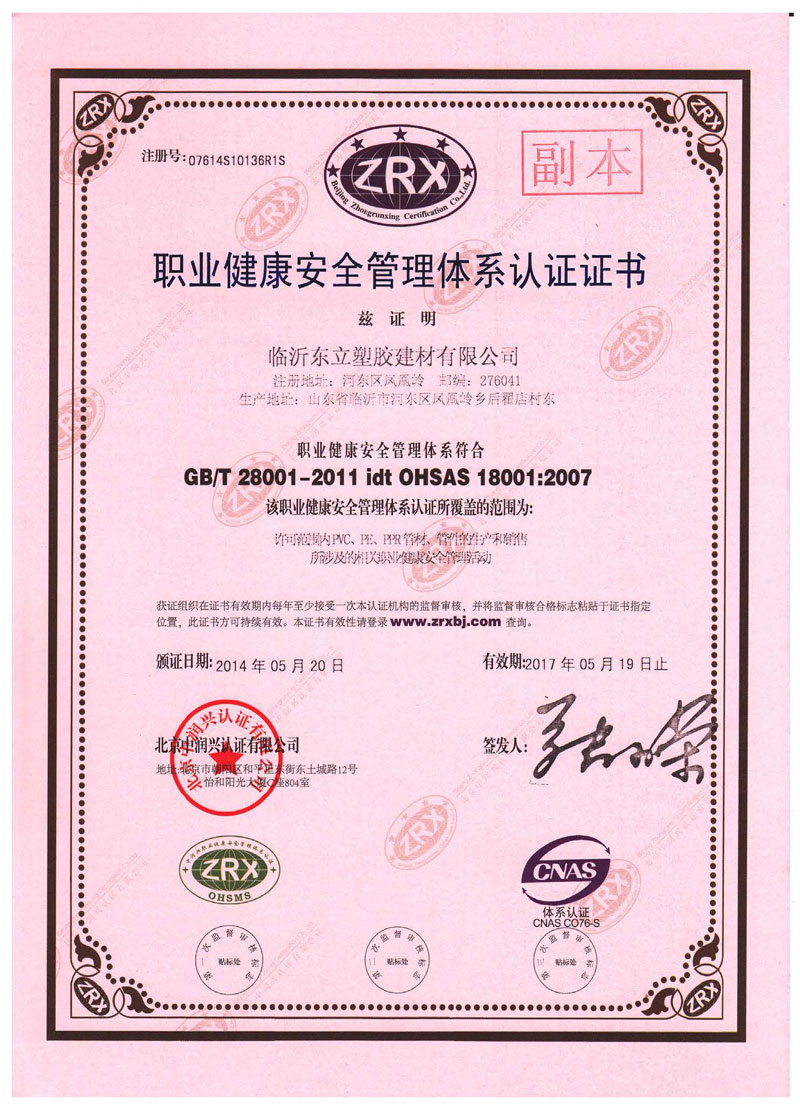 职业健康安全管理体系认证证书
