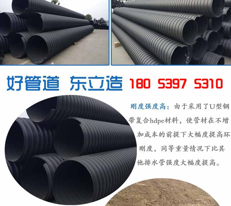 2.大口径高强度:由于采用了U型钢带复合PE材料,使管材在不增加成本的前提下大幅度提高环刚度,同等重量情况下比其他塑料排水管强度大幅度提高。可解决重载等一系列问题,大口径管材优势更加明显,比水泥管和其它塑料管重量更轻、强度更高。